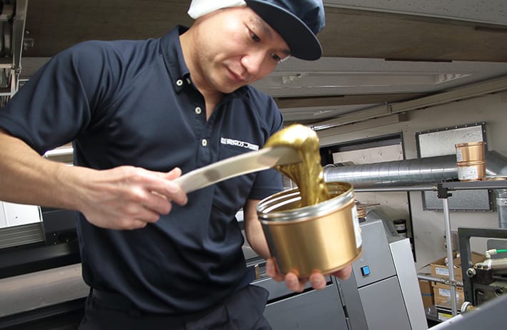 調色技術主に特色は、ブランドカラーや色ブレを起こしたくない部分に使用されることが多いです。つまり、特色部分はお客様が特に大切にしている部分です。弊社では熟練のオペレーターが色見本に合わせて特色を調色いたします。また工場内に調色機があるため、立ち会いにお越しいただき、その場で色を調整することも可能です。